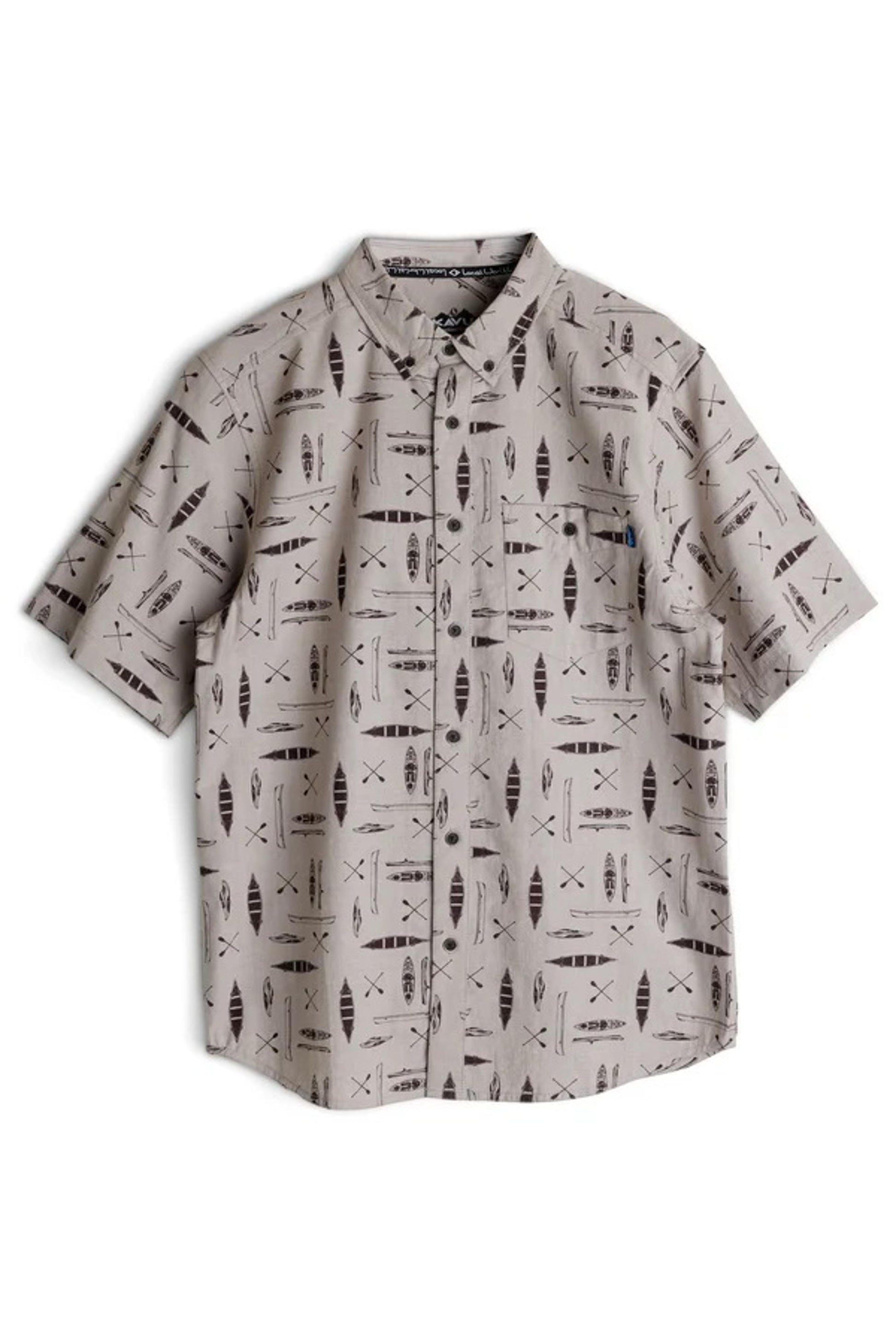 Casual fit, short sleeve button up shirt, button down collar with interior KAVU logo jacquard tape, single chest pocket with button closure, 25% certified recycled polyester faux wood buttons, back bias cut yoke with center back box pleat, curved hem