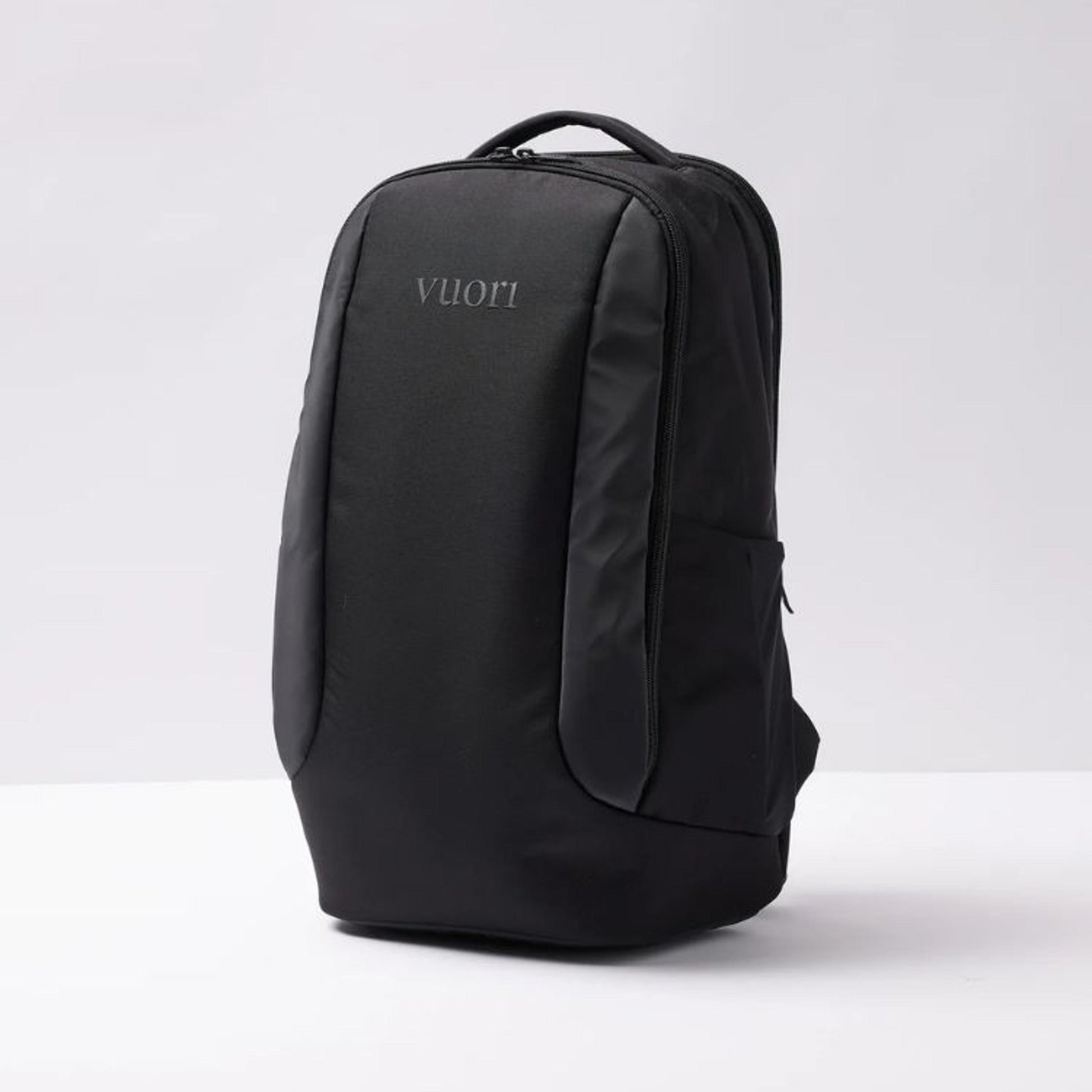 Sleek and technical backpack with Ballistic Nylon body fabric and TPU accents. Large main compartment with interior mesh pockets at front and rear. Exterior zippered laptop sleeve with sunglass pocket. Side water bottle pockets. Debossed Vuori logo at rear panel. Vuori print logo at front. 19" x 13" x 6" Volume 19L